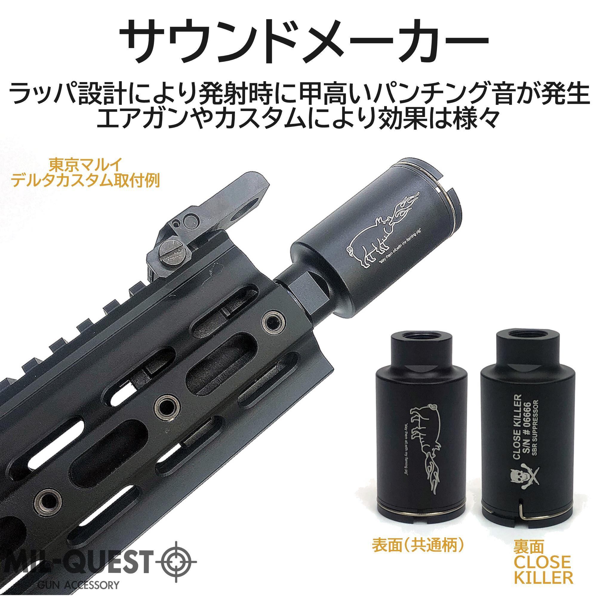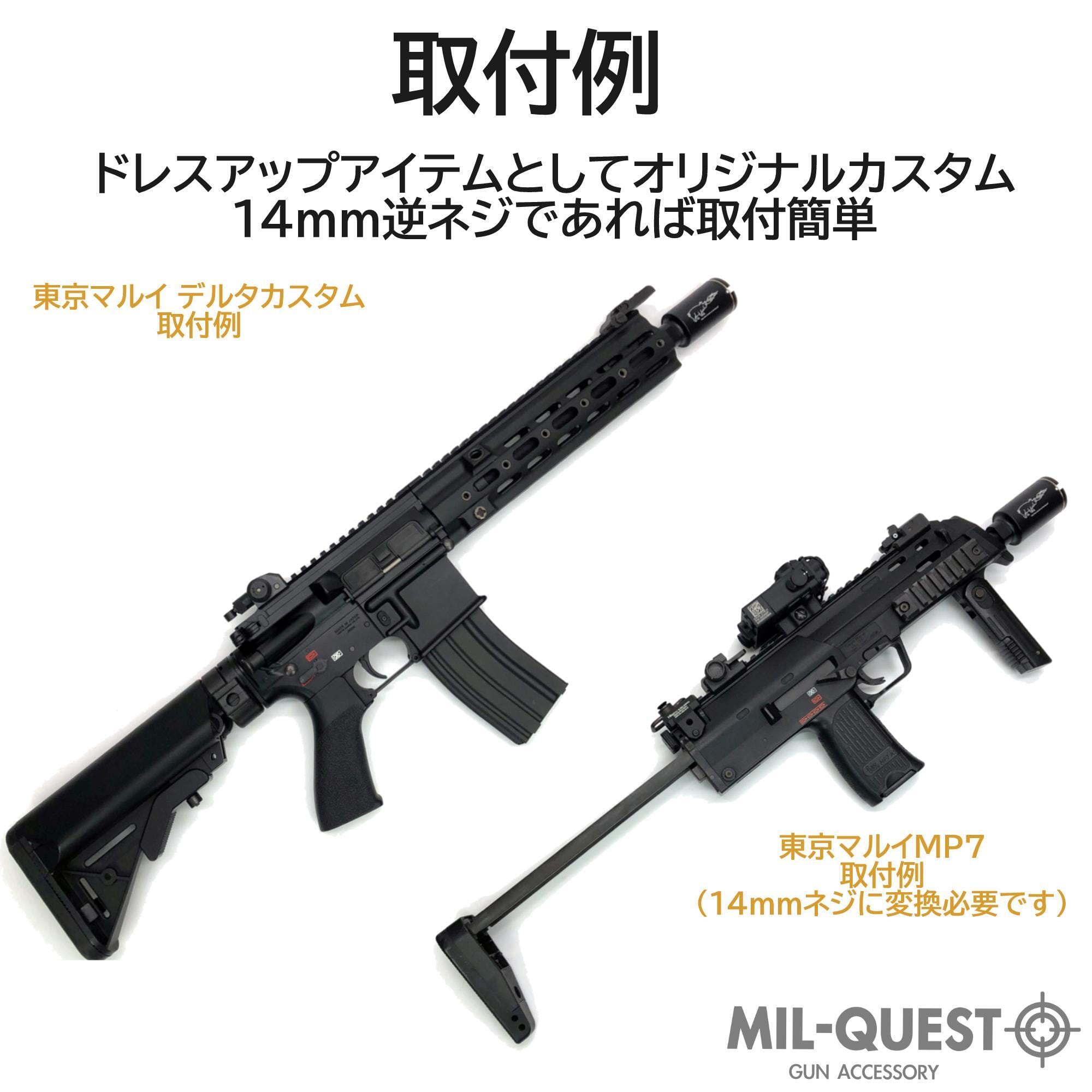 14mm逆ネジ対応なので東京マルイ電動ガンや次世代ガン、G&Gのエアガンなど幅広いトイガンに対応します。