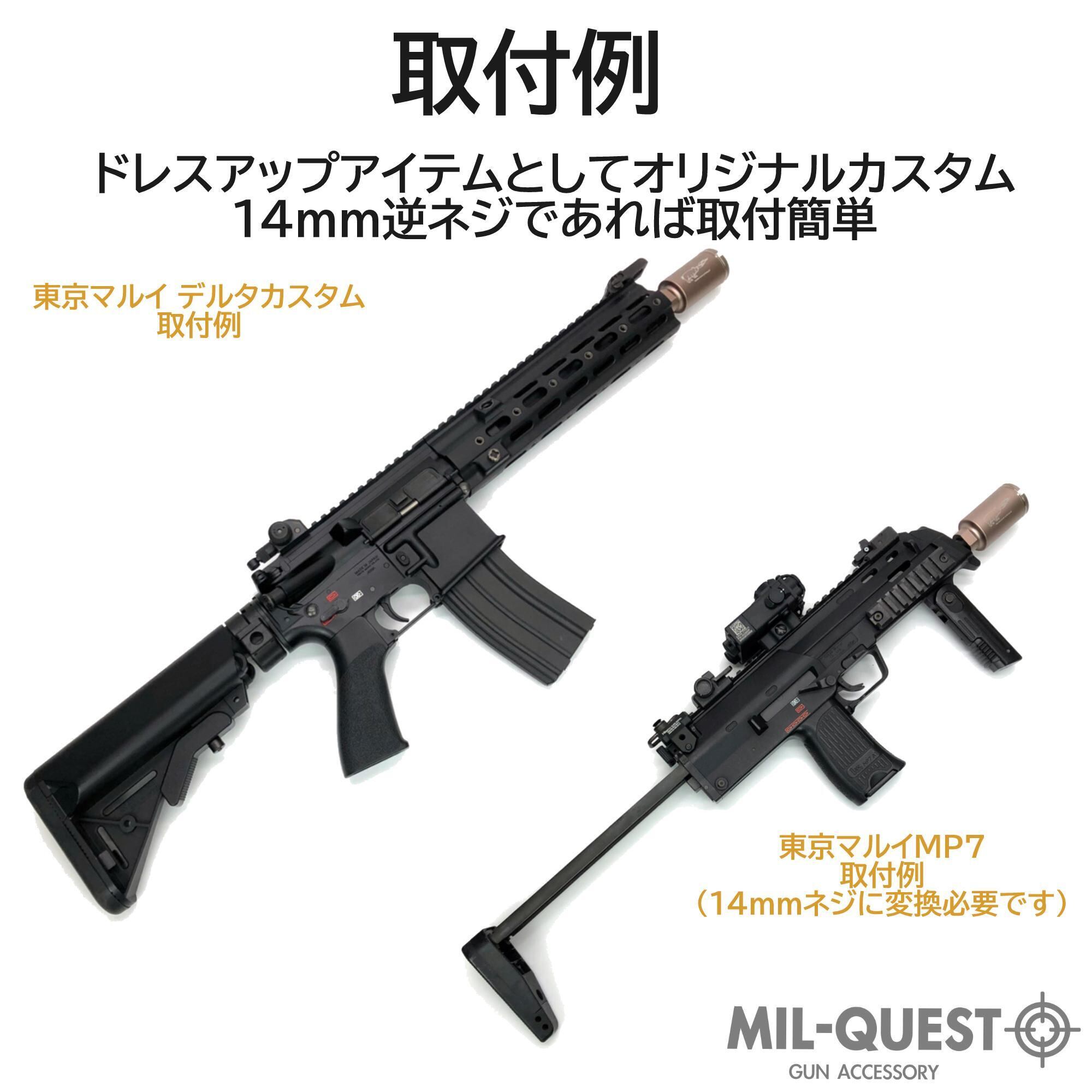 14mm逆ネジ対応なので東京マルイ電動ガンや次世代ガン、G&Gのエアガンなど幅広いトイガンに対応します。